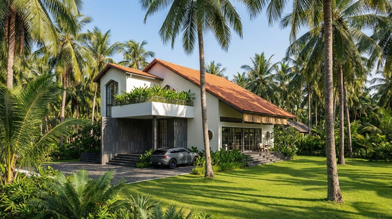 Công trình mang phong cách kiến trúc nhiệt đới đương đại, kết hợp hài hòa giữa đường nét hiện đại và giải pháp thích ứng khí hậu bản địa. Mái dốc lợp ngói đất nung với độ vươn lớn cùng các không gian hiên, ban công giúp giảm bức xạ nhiệt và tạo cảm giác ấm áp về thị giác. Mặt đứng sơn trắng được nhấn bằng đá tự nhiên, vật liệu gỗ và các mảng kính lớn, tăng cường sự kết nối giữa không gian trong và ngoài nhà. Nội thất tổ chức theo không gian mở, phòng khách thông tầng với kết cấu mái lộ, đón nhiều ánh sáng và gió tự nhiên, mang lại cảm giác thông thoáng, tiện nghi và gắn bó chặt chẽ với cảnh quan xung quanh.